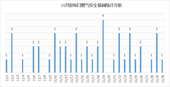 11月份平均每天发生燃气安全新闻不足2起,11月19日是全月的事故高发期,当日事故达4起。